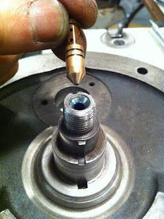 checking bore is right angle against cylinder base surface, and it wasn't, it had bored in angle tipped towards posh rod side, that is explain about scratch on piston |